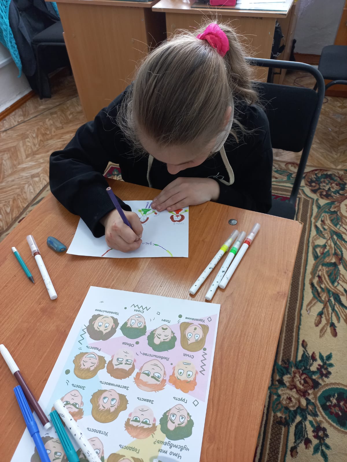 Во время занятия ребята на листе бумаги изображали собственные эмоции, которые испытывают, а рядом записывали способы и приемы выхода из конкретной эмоциональной ситуации.